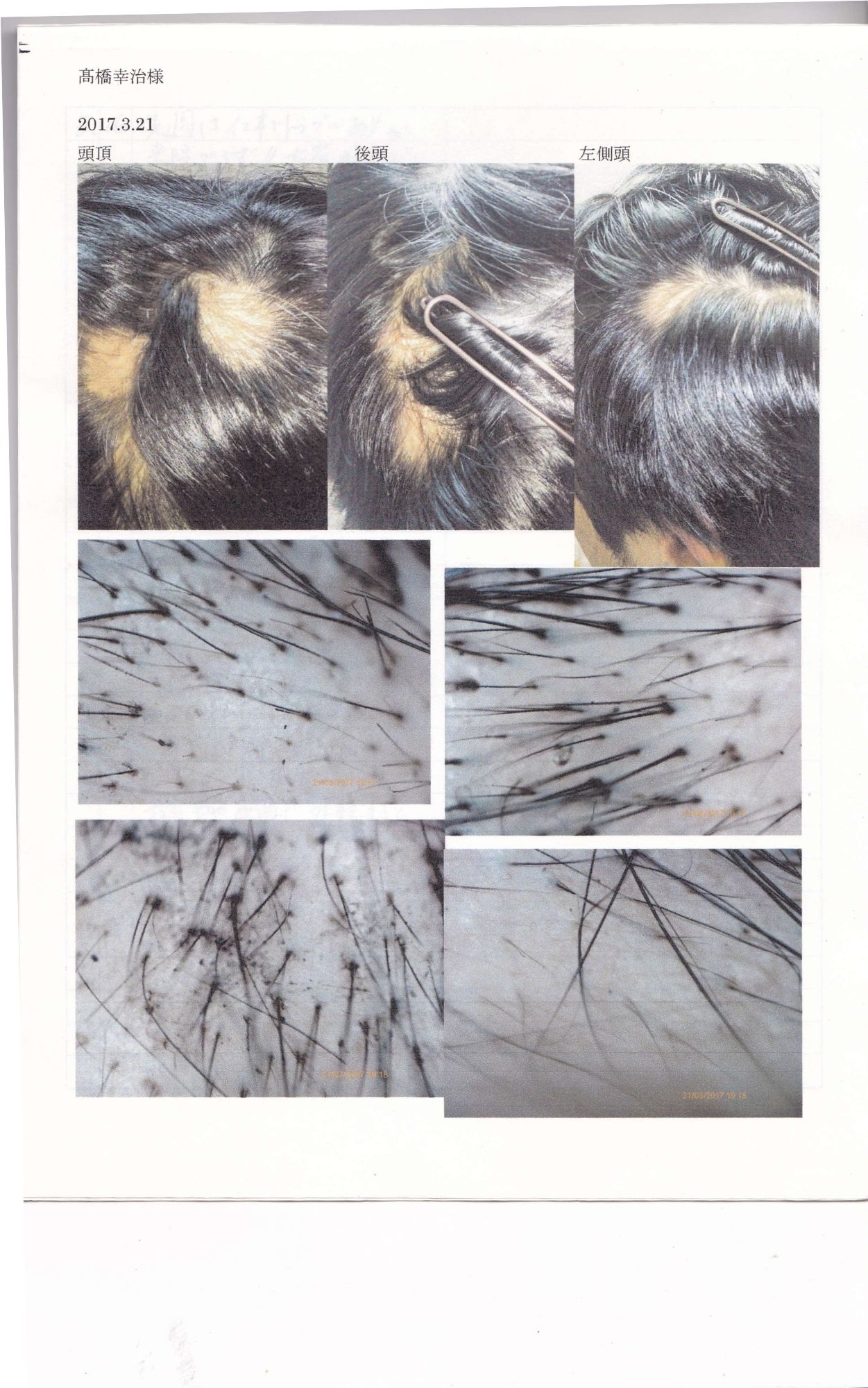 中学生の時に一か所円形脱毛ができたが、すぐに治った。その後脱毛がおこることはなかったが、来院の一年前に左顎のひげが脱毛、すぐに発毛。その後右顎ひげ脱毛。当院来院4カ月前、頭部に複数個の脱毛。皮膚科受診なし、血行をよくするようマッサージをしたりしていた。イライラや仕事のストレスは多いが特に原因と思われることはない。