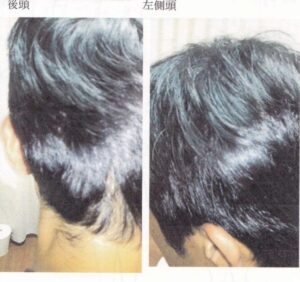 1歳10か月ごろ、頭頂部に脱毛をご家族が発見。ステロイドを使用し、徐々にはえそろったが、また脱毛してしまう。その後は発毛しては脱毛し、脱毛する箇所がどんどん増えていった。局所免疫療法を行い発毛したがまた脱毛してしまい、その後塗らなくても生えるならとステロイドも中止され、半年ほどたった状態で来院された。来院された時には、前頭両側、左側頭、後頭に2か所、脱毛個所があった。治療3回目の時に、産毛が見られはじめ徐々に発毛。ずっと発毛が見られなかった左側頭に発毛がみられたが、右側頭の脱毛がすすんでいた。途中流行性耳下腺炎(おたふく風邪)にかかってしまい、一時脱毛が進んでしまったが、ある時よりぴたりととまり、その後は順調に発毛。計25回の治療で終了となった。